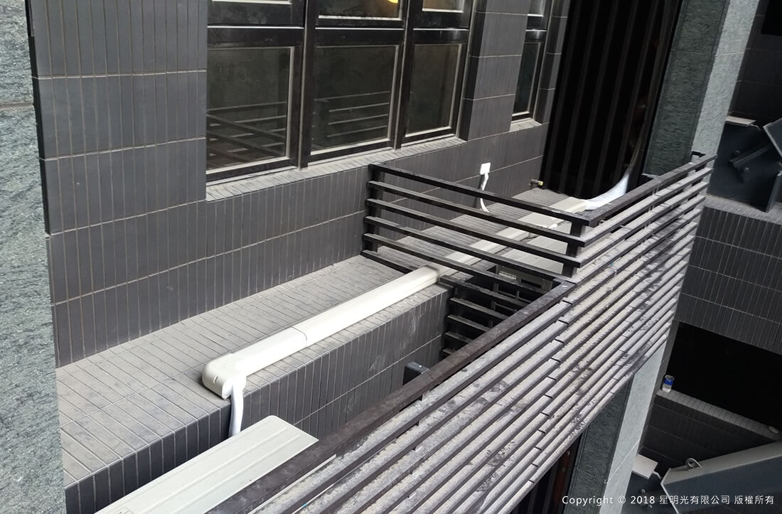 2. 室外機安裝在大樓預留的位置,管槽以對大樓外觀影響最小的方式,設置在水平方向,整理得乾淨、整潔。就算真的特別查看這部分,也算是最好的處理方式了。